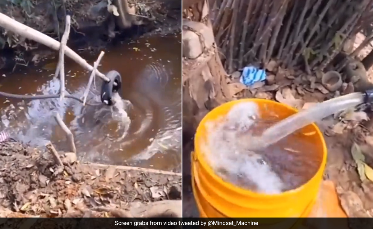 माइंडसेट मशीन नामक पेज द्वारा ट्विटर पर शेयर किया गया, ये वीडियो एक अविश्वसनीय जुगाड़ तकनीक (jugaad technique) दिखाता है. इसकी शुरुआत एक शख्स द्वारा पाइप के साथ टायर से जुड़े एक बड़े पोल को धकेलने से होती है. जैसे ही शख्स पोल के टायर के सिरे को धीरे-धीरे पानी में नीचे करता है, वह रबर के अंदर इकट्ठा हो जाता है. फिर वह पोल को ऊपर उठाता है और पानी पाइप के माध्यम से एक बाल्टी में गिरता है.