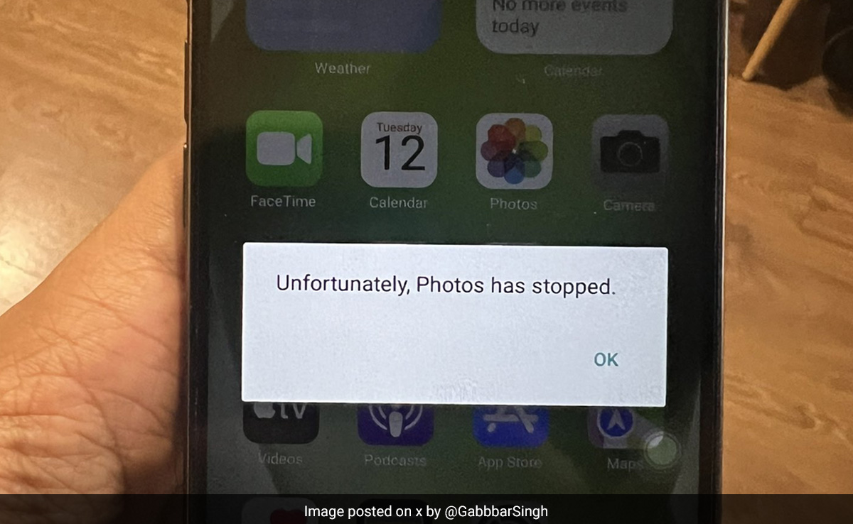 यह घटना तब सामने आई जब एक एक्स यूजर @GabbbarSingh ने उसे मिले iPhone 15 की एक तस्वीर पोस्ट की. तस्वीर के साथ स्क्रीन पर एक संदेश भी था, जिसमें लिखा था, "दुर्भाग्य से, तस्वीरें बंद हो गई हैं."