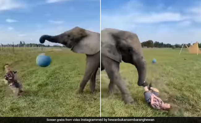 वायरल हो रहे इस वीडियो में आप देखेंगे कि हाथी के सामने फुटबॉल रखा है और वहीं सामने एक शख्स भी खड़ा है. हाथी फुटबॉल को इतने ज़ोर से मारता है कि फुटबॉल सीधे जाकर शख्स के सिर पर लगता है और बॉल लगते ही वो शख्स धड़ाम से नीचे गिर जाता है. फिर हाथी अपनी सूंड में शख्स की टांग फंसाता है और उसे खींचता हुआ लेकर चला जाता है.