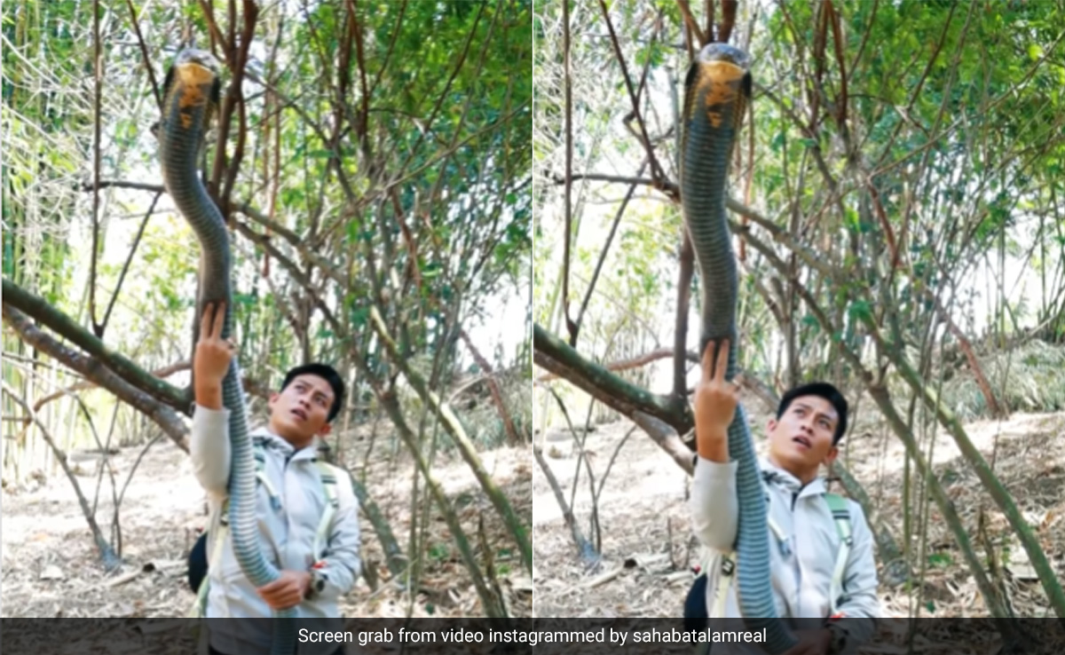 इस वीडियो को @sahabatalamreal नामक इंस्टाग्राम यूजर द्वारा शेयर किया गया था. इस मनोरंजक क्लिप में, एक शख्स बहादुरी दिखाते हुए एक विशाल कोबरा (King Cobra) को हाथ में पकड़े खड़ा है और पोज बनाने की कोशिश करता है.