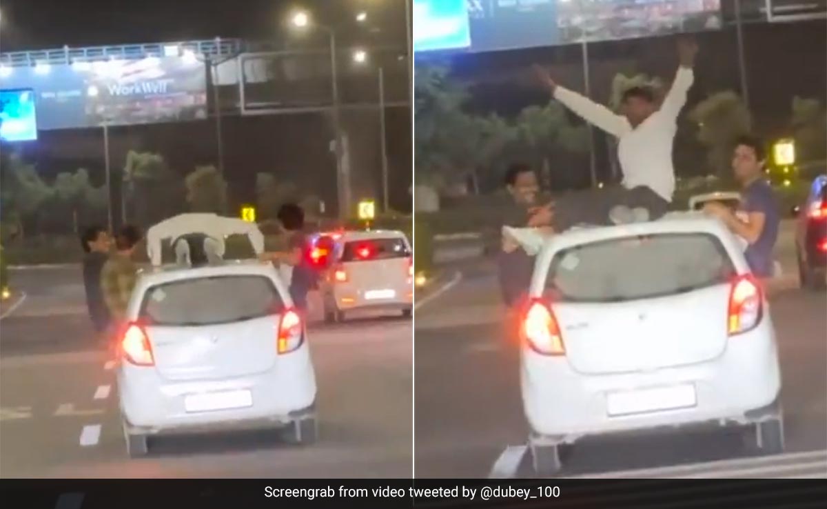 सोशल मीडिया प्लेटफॉर्म ट्विटर पर इस वीडियो को शेयर किया गया है, जिसे देख लोग दंग हैं. 30 मई को पोस्ट किए गए इस पोस्ट को शेयर करते हुए कैप्शन में लिखा गया है, 'इन्हें ना किसी की जान की परवाह है और ना ही गुड़गांव ट्रैफिक पुलिस की.' पोस्ट में वीडियो और फोटो शेयर करते हुए कैप्शन में गुड़गाव पुलिस के साथ-साथ और भी कुछ लोगों को टैग किया गया है. वीडियो में देखा जा सकता है कि, कैसे पांच युवक नशे की हालात में सफेद रंग की 'ऑल्टो 800' पर खतरनाक स्टंट करते हुए दिखाई पड़ रहे हैं. वीडियो में एक युवक चलती कार की छत पर पुशअप्स लगा रह है, तो वहीं अन्य लोग कार की विंडो से निकलकर हवा में लहरा रहे हैं. वहीं वीडियो के आखिर में सभी लटके-लटके नाचते नजर आ रहे हैं.