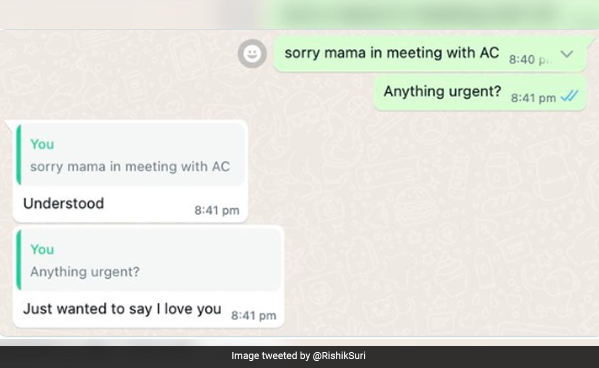 फिलहाल, ऐसा ही कुछ इस शख्स के साथ भी हुआ. जब वो एक मीटिंग में था और उसे उसकी मां से एक प्यारा सा मैसेज मिला. जिसका एक स्क्रीनशॉट उन्होंने सोशल मीडिया पर शेयर किया है, जो आपको भी जरूर देखना चाहिए. इस पोस्ट को ऋषिक सूरी नाम के यूजर ने ट्विटर पर शेयर किया है. पोस्ट में ऋषिक की मां के साथ बातचीत का स्क्रीनशॉट दिखाया गया है. वह एक मीटिंग के बीच में था और उसे अपनी मां से "आई लव यू" टेक्स्ट मिला.