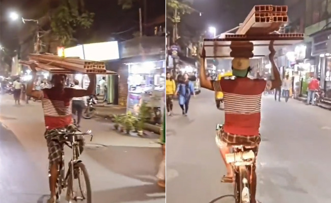 वीडियो में देखा जा सकता है कि, कैसे एक शख्स साइकिल पर सवार होकर व्यस्त रोड पर जा रहा है. इस दौरान शख्स सिर पर कुछ सामान रखे हुए है. हैरानी की बात तो ये है कि शख्स सामान को दोनों हाथ से पकड़े हुए है और पैरों से साइकिल के पैडल चला रहा है, वो भी बिना हैंडल पकड़े. यूं तो सिर पर सामान को बैलेंस करके साइकिल चलाना काफी असंभव सा काम है, जिसे इस शख्स ने संभव कर दिखाया है. वीडियो में शख्स का ज़बरदस्त कॉन्फिडेंस वाकई देखने लायक है.