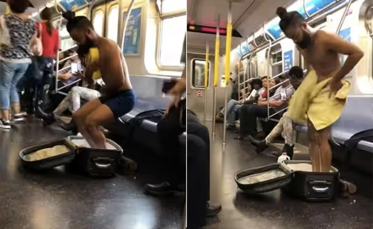 Man Taking Shower Inside Subway In New York City: आज के समय में लोग सोशल मीडिया फॉलोअर्स (Social Media Followers) बढ़ाने और चर्चा में आने के लिए किसी भी हद तक जाने को तैयार रहते हैं. हाल ही में ऐसे कई वीडियोज इंटरनेट पर देखने को मिलते रहते हैं, जिन्हें देखकर आपकी भी आंखें भी फटी की फटी रह जाएंगी. इन वायरल वीडियोज में कभी कपल मेट्रो (metro) में एक-दूसरे को किस करते, कभी कोई डांस (dance) के दौरान रील्स बनाते, तो कभी कोई शॉर्ट कपड़ों में हर किसी का ध्यान अपनी ओर खींचते नजर आते हैं. हाल ही में एक ऐसा ही वीडियो सामने आ रहा है, जो सोशल मीडिया पर धड़ल्ले से वायरल हो रहा है. वीडियो में एक शख्स चलती मेट्रो के अंदर मजे से नहाते नजर आ रहा है, जिसे देखकर यूजर्स भी हक्के-बक्के रह गए हैं.