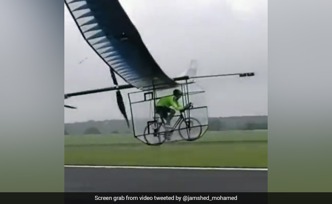 छोटी क्लिप में हवाई जहाज जैसे पंखों द्वारा बनी एक पारदर्शी वर्गाकार बाड़े को दिखाया गया है, और एक शख्स इसके अंदर साइकिल चला रहा है. मेकशिफ्ट एविएशन मशीन के साथ एक शख्स भी दौड़ता हुआ दिखाई देता है क्योंकि अंदर साइकिल सवार स्पीड पकड़ता है. सेकंड बाद, मशीन को उड़ान भरते हुए देखा जाता है, माना जाता है कि साइकिल चलाने से उत्पन्न शक्ति की मदद से और यह जमीन से टकराने से पहले कुछ समय के लिए हवा में रहती है.