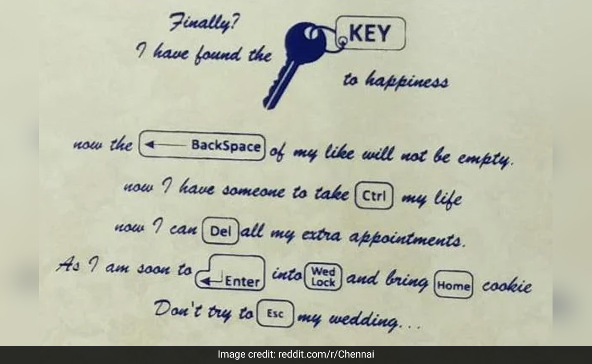 सोशल मीडिया पर वायरल हो रहे इस कार्ड में लिखे इनविटेशन को शख्स ने अंग्रेजी में क्रिएटिव अंदाज़ में लिखवाया है. जिसमें लिखा है- फाइनली, मुझे खुशियों की चाबी (यहां चाबी की ड्राइंग बनी है) मिल गई. अब किसी को पसंद के बाद Backspace (साइन के साथ) दबाकर दोबारा खालीपन लाने की जरूरत नहीं होगी. अब मेरे पास कोई है जो जिंदगी को कंट्रोल (Ctrl) कर सकता है. अब मैं अपने सभी एक्स्ट्रा अपॉइंटमेंट को डिलीट (Del) कर सकता हूं. क्योंकि मैं जल्द ही अपने वेडलॉक (wedlock) में एंटर (enter) कर, घर पर होम (home) कुकी लेकर आने वाला हूं. मेरी शादी (esc) मिस करने की कोशिश मत करना.