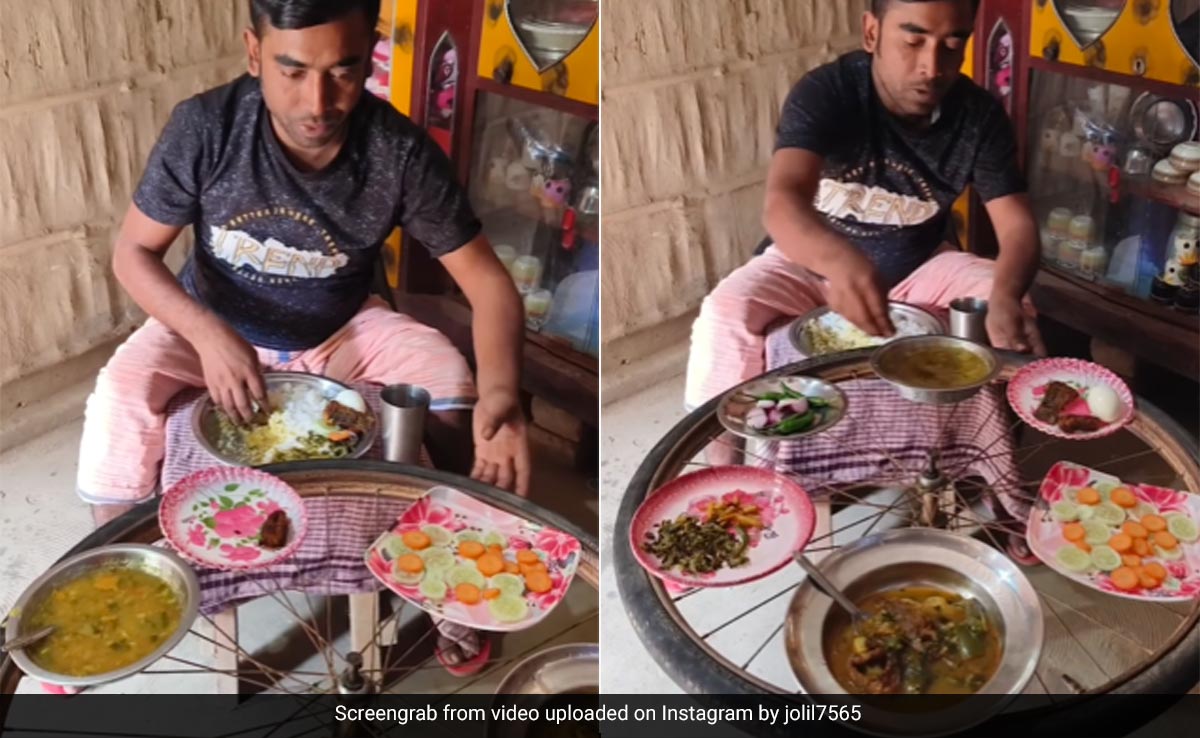 3 दिन पहले इंस्टाग्राम पर पोस्ट किए गए वीडियो में अब्दुल आराम से एक स्टूल पर बैठा हुआ है, जिसमें सलाद, मछली करी, दाल और उबले अंडे जैसे विभिन्न प्रकार के व्यंजन साइकिल के टायर पर बड़े करीने से रखे हुए हैं. एक साधारण स्पिन के साथ, वह अपनी इच्छानुसार किसी भी व्यंजन को बड़े आराम से ले सकता है, जिससे उसके भोजन का समय एक स्वादिष्ट अनुभव में बदल जाता है. यह "देसी जुगाड़" का एक उदाहरण है, जैसा कि सोशल मीडिया यूजर्स ने नोट किया है.