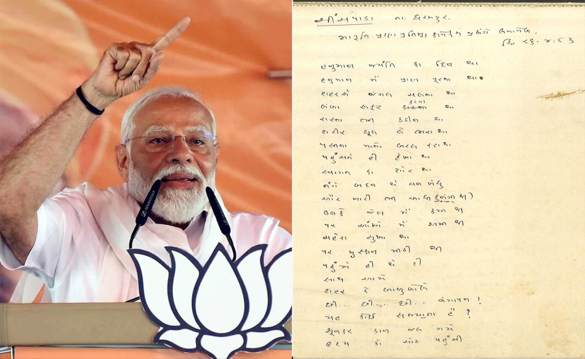प्रधानमंत्री नरेंद्र मोदी के द्वारा 1983 में लिखी गई एक कविता के कुछ अंश सोशल मीडिया पर वायरल हो रहे हैं. इस कविता के जरिए पीएम मोदी ने आदिवासियों की स्थिति और संघर्षों को समझाने की कोशिश की है. दरअसल, नरेंद्र मोदी ने इस कविता को जिस परिस्थिति में लिखा, वह बड़ा दिलचस्प है. 'मारुति की प्राण प्रतिष्ठा' शीर्षक वाली इस कविता का एक अंश जो नरेंद्र मोदी के द्वारा हस्तलिखित है, उसकी प्रति सोशल मीडिया प्लेटफॉर्म एक्स पर खूब शेयर की जा रही है.