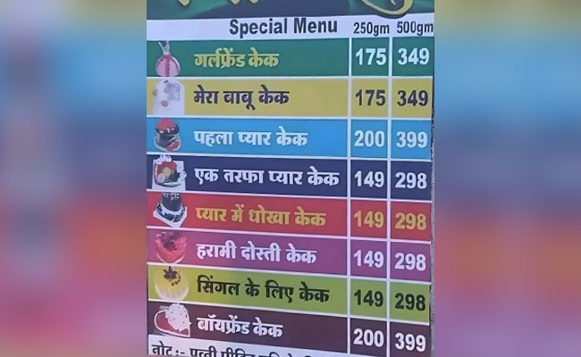 वायरल हो रहे इस मेन्यू कार्ड में 250 ग्राम वाला गर्लफ्रेंड केक और मेरा बाबू केक 175 रुपये का है, वहीं 500 ग्राम का 349 का है. इसी तरह 250 ग्राम वाला पहला प्यार केक 200 रुपये का है, वहीं 500 ग्राम का 399 का है. इसी तरह 250 ग्राम वाला एक तरफा प्यार केक, प्यार में धोखा केक, दोस्ती केक और सिंगल के लिए केक की प्राइज 149 रुपये है, जबकि 500 ग्राम वाला 298 का है. सबसे आखिर में 250 ग्राम वाला ब्वॉयफ्रेंड केक 200 रुपये का है. वहीं 500 ग्राम वाला 399 का है. वायरल हो रही इस पोस्ट को अब तक 15 हजार से ज्यादा लोग लाइक कर चुके हैं. इंटरनेट पर लोग इन तस्वीरों को देखकर तरह-तरह की प्रतिक्रियाएं दे रहे हैं. एक यूज़र ने लिखा, 'नोट को क्रॉप क्यों किया, मुझे पढ़ना था.'