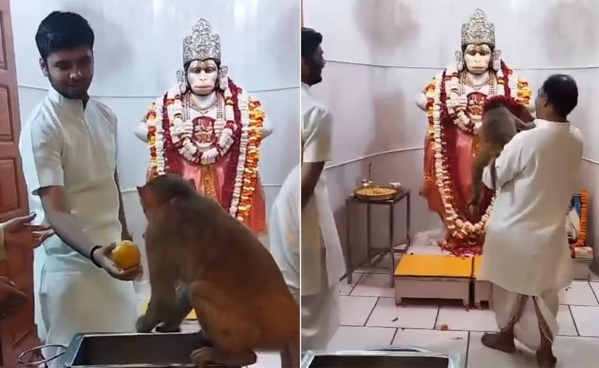 insta__monk नाम के अकाउंट से इस वीडियो को शेयर किया गया है. वीडियो में एक वानर हनुमान जी के मंदिर में उनकी प्रतिमा के सामने बैठा नजर आता है. मंदिर में पंडित वानर महाराज को फल खाने के लिए देते हैं, लेकिन वह फल देख कर मुंह मोड़ लेते हैं. इसके बाद एक दूसरे पंडित जैसे ही हनुमान जी की प्रतिमा पर माला चढ़ाने के लिए आगे बढ़ते हैं वानर आगे बढ़ता है और माला पंडित जी के हाथों से छीन लेता है. पहले तो ऐसा लगता है जैसे वानर महाराज खुद इस माला को हनुमान जी को चढ़ाना चाहते हैं, लेकिन फिर एक कमाल की चीज होती है. वानर ये माला खुद अपने गले में पहन लेते हैं. इसके बाद वहां मौजूद हर कोई झुक कर उसे प्रणाम करने लगता है.