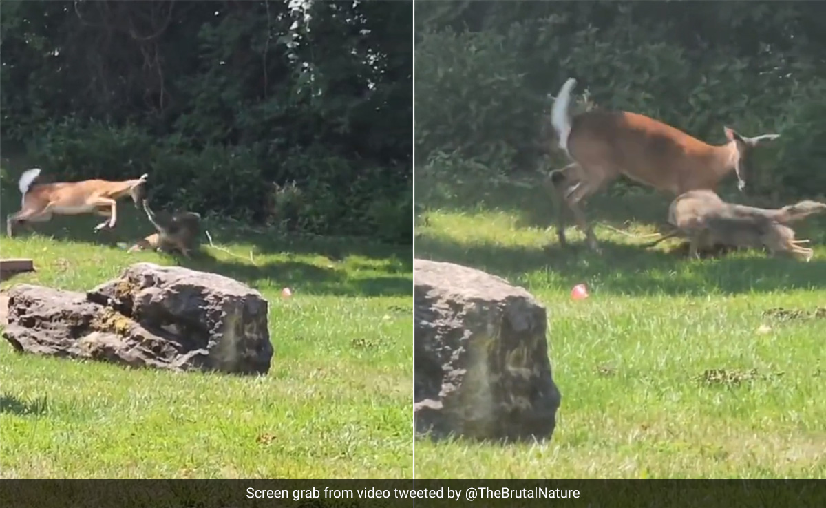 अपने बच्चे को जंगली सियार से बचाती हिरण