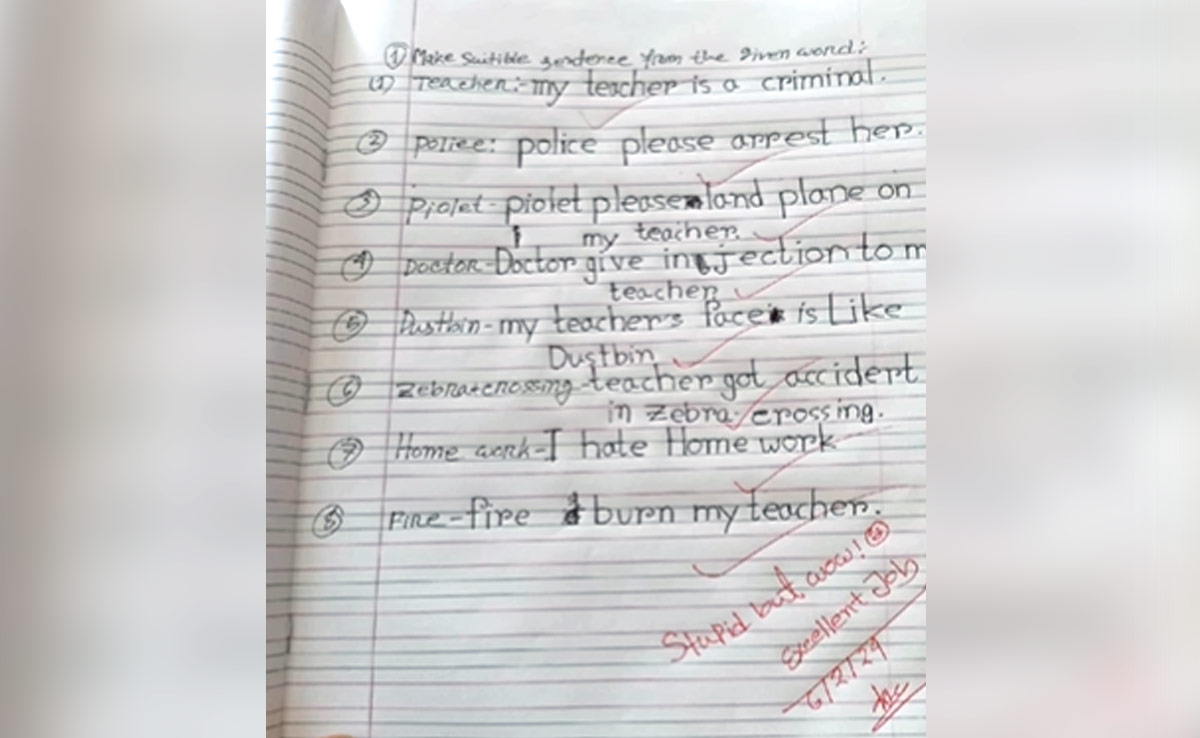 वायरल हो रहे वीडियो में आप देख सकते हैं कि इंग्लिश का पेपर है. पेपर में कुछ शब्द दिए गए हैं, जिन्हें अपने वाक्य में प्रयोग करके दिखाना है. स्टूडेंट ने हर शब्द का प्रयोग करते हुए अपनी टीचर के बारे में कुछ न कुछ गलत और बुरा लिखा. जैसे कि पुलिस शब्द का प्रयोग करते हुए उसने लिखा – पुलिस मेरी टीचर को पकड़ लो. पायलट शब्द के साथ लिखा- पायलट, मेरी टीचर के ऊपर प्लेन लैंड कर दो. यहां तक कि फायर शब्द के इस्तेमाल में उसने लिखा- आग, मेरी टीचर को जला दो.