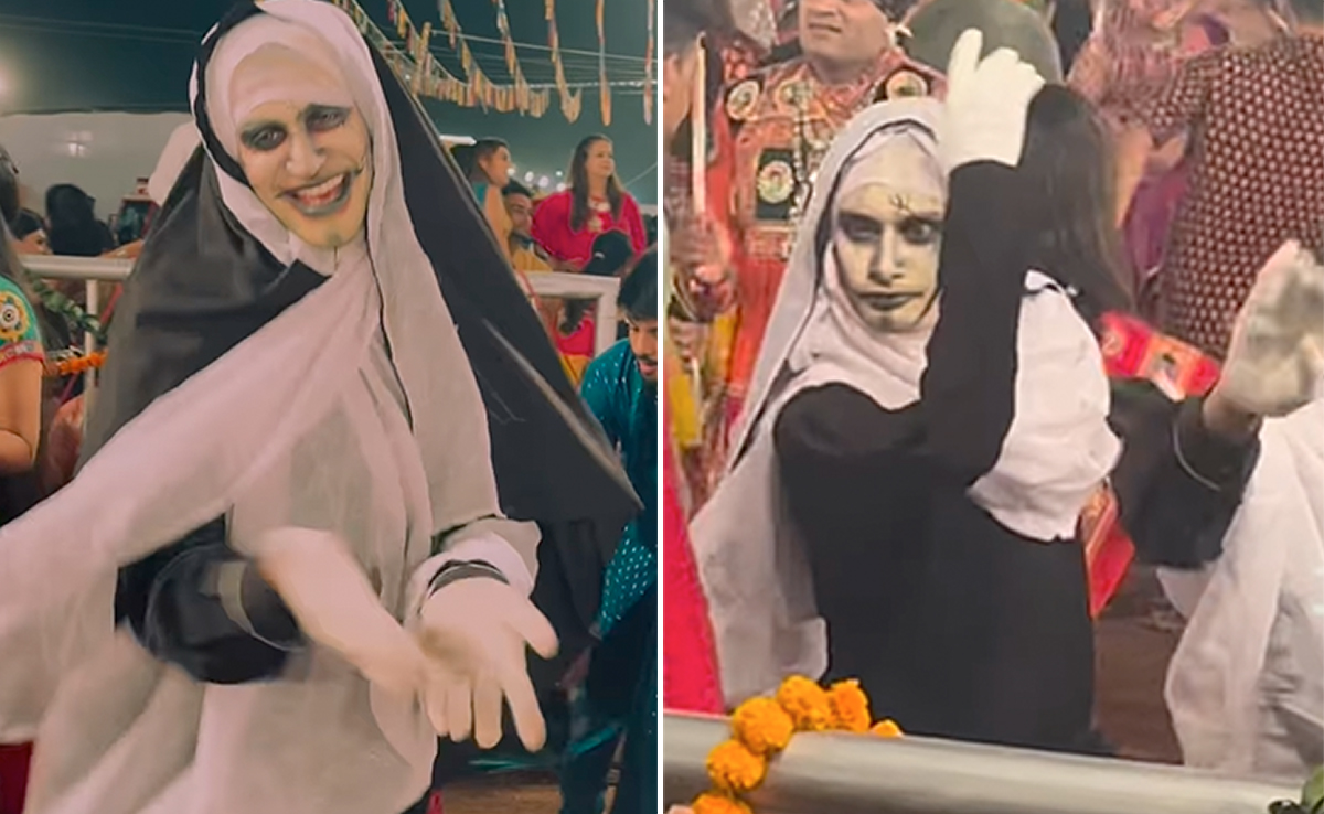 इन दिनों इंटरनेट गरबा और डांडिया नाइट के वीडियोज़ से भरा पड़ा है, लेकिन इस बीच इंटरनेट पर एक ऐसा वीडियो तेज़ी से वायरल हो रहा है, जिसे देखकर लोग हैरान हैं. डांडिया नाइट में डांडिया करते नन दिखाई दे रही हैं. अगर यह खबर पढ़कर आपके हाथ-पैर ठंडे हो रहे हैं, तो घबराइए मत. ये भी गरबा करने का एक अतरंगी स्टाइल है, जो इन दिनों हर किसी को हैरानी में डाल रहा है. दरअसल, इस वीडियो में दो लोग काले कपड़े पहन कर डांडिया करते हुए दिख रहे हैं. चेहरे पर सफेद रंग पुता हुआ है और इतने डरावने दिख रहे हैं कि, कोई भी ख़ौफ़ज़दा हो जाए. इस डांडिया डांस को देखकर लोग कह रहे हैं, क्या गरबा खेलने 'भूत' जमीन पर उतर आए हैं.