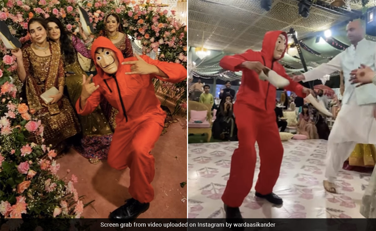 पाकिस्तान (Pakistan) में एक शादी में कुछ ऐसा ही हुआ, जहां दुल्हन के भाई ने अनोखे स्टाइल में जूता छुपाई की रस्म निभाई. दुल्हन वर्दा सिकंदर ने अपने भाई द्वारा की गई एंटरटेनिंग 'जूता चुराई' का एक वीडियो शेयर किया. इंस्टाग्राम पर शेयर किए गए वीडियो में दुल्हन के भाई को लाल आउटफिट और सल्वाडोर डाली मास्क पहने देखा जा सकता है. वह मंच पर भागता है और दूल्हे के जूते चुराता है और यहां तक कि बेला सियाओ के देसी वर्जन पर डांस भी करता है.