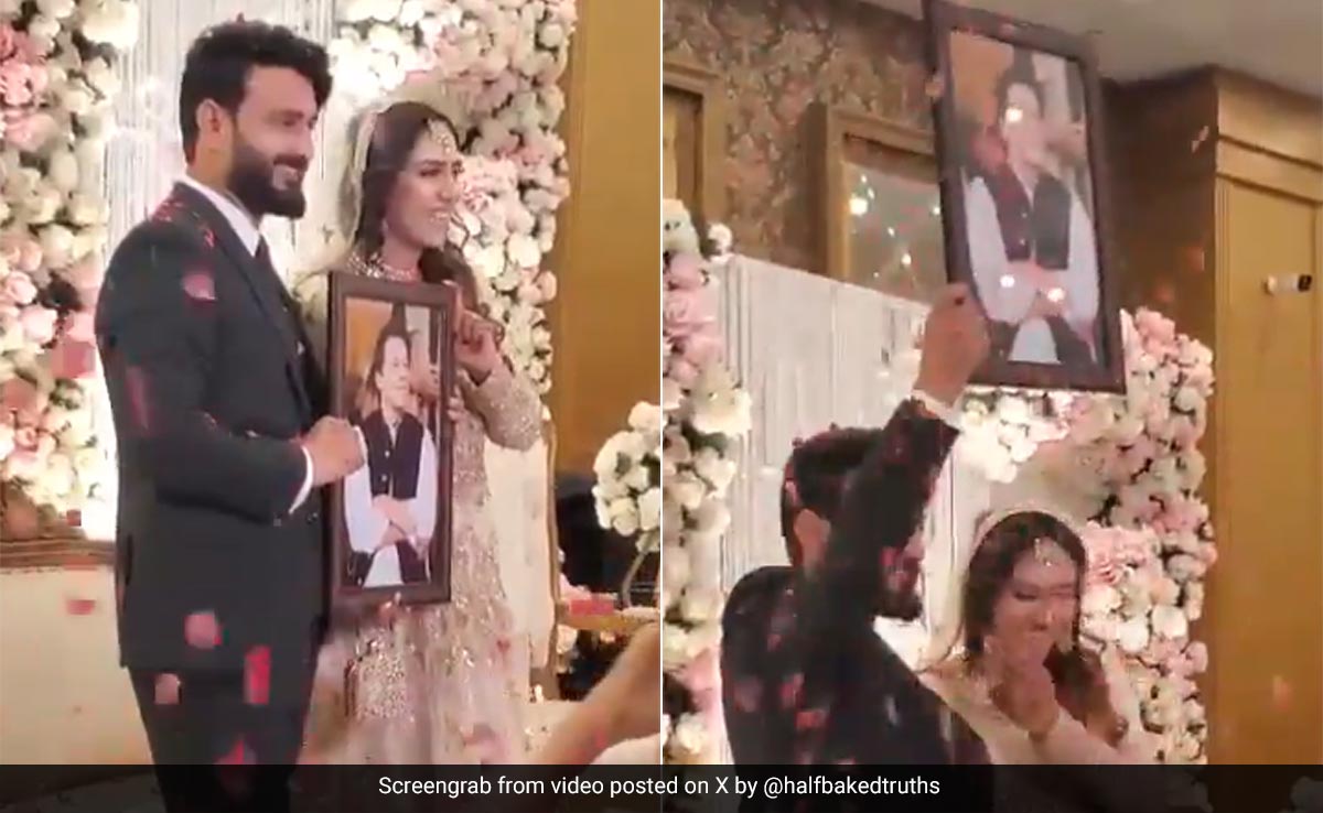 एक दूल्हे द्वारा अपनी शादी के दिन अपनी दुल्हन को जेल में बंद पाकिस्तान के पूर्व प्रधान मंत्री (Former Prime Minister of Pakistan) इमरान खान (Imran Khan) की एक फ्रेम की हुई तस्वीर तोहफे में देने का एक वीडियो सोशल मीडिया पर वायरल हो गया है. वीडियो में दूल्हे को मंच पर खड़े होकर, अपनी नवविवाहित दुल्हन के लिए खरीदे गए गिफ्ट को खोलते हुए दिखाया गया है. जैसे ही दुल्हन को पता चलता है कि इसके अंदर क्या है, वह गिफ्ट देखकर अपनी खुशी ज़ाहिर करते हुए जोर-जोर से हंसने लगती है. दूल्हे ने आखिरकार गिफ्ट खोला और शादी में आए मेहमानों के सामने इमरान खान की फ्रेम की हुई तस्वीर गर्व से सबको दिखाई. फिर कपल ने फूलों की बारिश और मेहमानों के बीच फ्रेम को एक साथ पकड़कर खुशी-खुशी तस्वीरें खिंचवाईं.