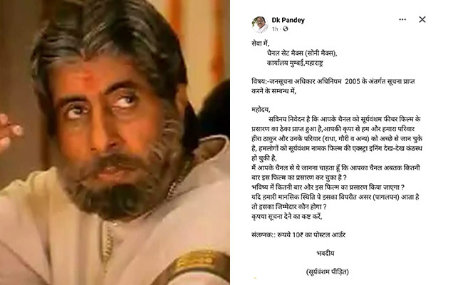 यूं तो टीवी पर हमने कई फिल्में देखी होंगी, मगर हम में से शायद ही कोई बचा होगा, जिसने बॉलिवुड मेगास्टार अमिताभ बच्चन (Amitabh Bachchan) की फिल्म सूर्यवंशम नहीं देखी होगी. सूर्यवंशम एक ऐसी फिल्म बन चुकी है, जो फ्लॉप होते हुए भी सुपरहिट साबित हुई है. मूवी चैनल सेट मैक्स (SET Max) के पास सूर्यवशंम के सैटलाइट राइट्स थे और इस चैनल ने फिल्म को इतना दिखाया कि 'सूर्यवशंम' से सेट मैक्स का नाम भी जुड़ गया. ऐसा कोई सप्ताह नहीं है, जब इस फिल्म का प्रसारण ना हुआ हो. देश का बच्चा-बच्चा इस फिल्म की कहानी से अवगत हो चुका है. हालांकि, सोशल मीडिया पर अब इस फिल्म का मज़ाक उड़ रहा है. इस फिल्म पर एक यूज़र ने चिठ्ठी भी लिखी है, जो काफी वायरल हो रही है.