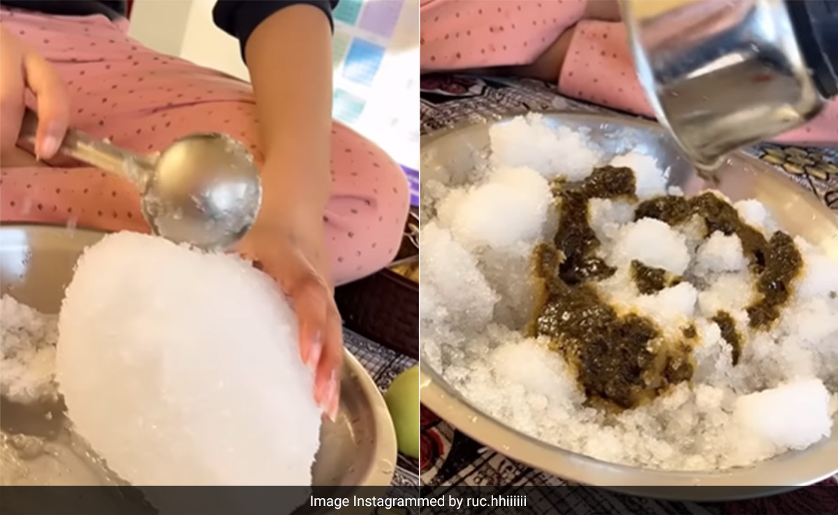 वायरल हो रहे इस वीडियो को इंस्टाग्राम पर ruc.hhiiiiii नाम की यूजर ने शेयर किया है. वीडियो में आप देख सकते हैं कि सबसे पहले एक बड़ी सी थाली में बर्फ के गोले को निकालकर रखा. फिर बर्फ को एक करछी से पूरी तरह क्रश कर लिया. इसके बाद इसमें हरी चटनी, लाल मिर्च पाउडर, नमक और चीनी मिलाया जाता है और फिर उसे अच्छी तरह से मिक्स किया जाता है. इसके बाद एक कटोरी में इसे चम्मच के साथ खाने के लिए सर्व किया जाता है.