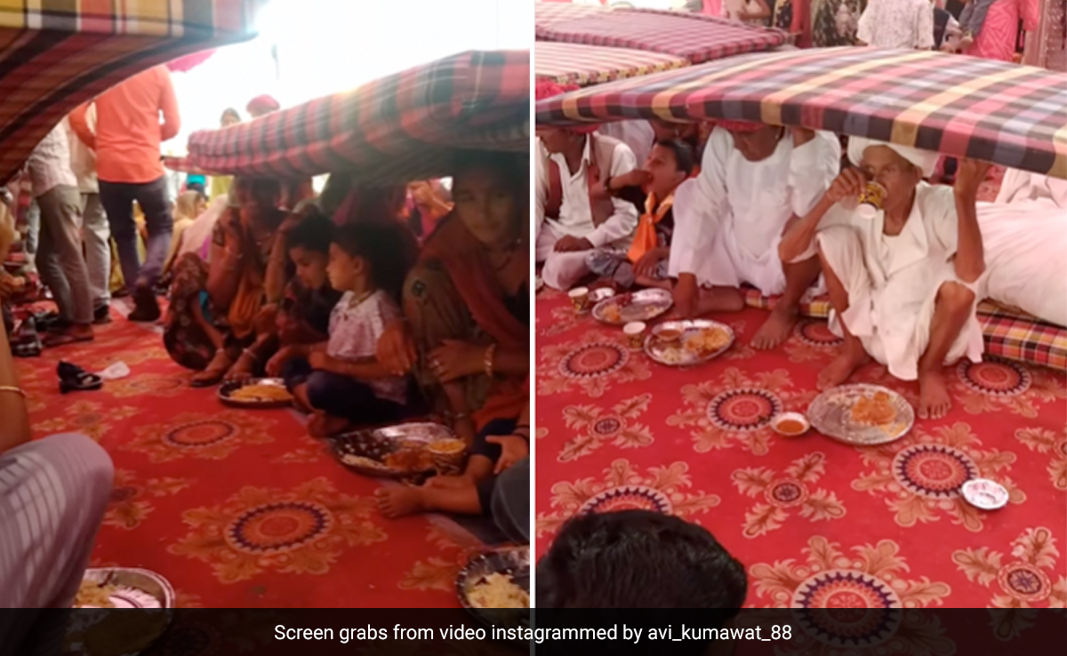 वायरल हो रहे इस वीडियो में आप देख सकते हैं कि बारिश हो रही है और लोग कतार में बैठकर खाना खा रहे हैं. खाना खा रहे लोगों में बुजुर्ग, युवा, बच्चे और महिलाएं सभी हैं. बारिश से बचने के लिए सबने वहां मेहमानों के लिए शादी में आए गद्दों से अपने सिर को ढक लिया है, ताकि वो भीगें नहीं और खाना खा सकें. एक-एक गद्दे को कई लोगों ने मिलकर अपने एक हाथ से पकड़ रखा है और बैठकर एक हाथ से खाना भी खा रहे हैं. उन्हें देखकर बिलुकल भी ऐसा नहीं लगा रहा है कि बारिश की वजह से उन्हें कोई परेशानी हो रही है.