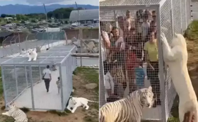आप अपनी लाइफ में कभी न कभी एक बार तो चिड़ियाघर गए ही होंगे, जहां आपको कई तरह के खतरनाक और अनोखे जानवर पिंजरे में बंद दिखाई दिए होंगे, लेकिन कभी आपने ऐसे किसी चिड़ियाघर को देखा या सुना है, जहां इंसानों को पिंजरे में बंद किया जाता है और जानवर खुलेआम आजाद घूमते नजर आते हैं. दरअसल, हाल ही में एक ऐसा ही वीडियो वायरल हो रहा है, जिसमें पिंजरे में इंसान दिख रहे हैं और सफेद बाघ पिंजरे में लोगों को देख रहे हैं. वीडियो में यह एक तरह का ह्यूमन जू जैसा दिख रहा है.