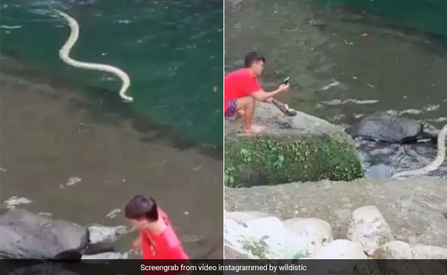 हाल ही में वायरल हो रहे इस वीडियो में नदी में साफ और नीले रंग का पानी दिखाई दे रहा है. इस दौरान लोग पानी में एन्जॉय करते नजर आ रहे हैं. वहीं एक शख्स पानी में सेल्फी लेता नजर आ रहा है, जिसके पीछे एक विशालकाय सांप देखा जा रहा है. इस बीच शख्स मौका पाकर पानी से निकल जाता है. इसके बावजूद सांप उसका पीछा नहीं छोड़ता. वह उसके पीछे-पीछे एक चट्टान तक आ जाता है. वहीं शख्स भी आखिर तक डरने के बावजूद सांप का वीडियो शूट करता दिखाई देता है.