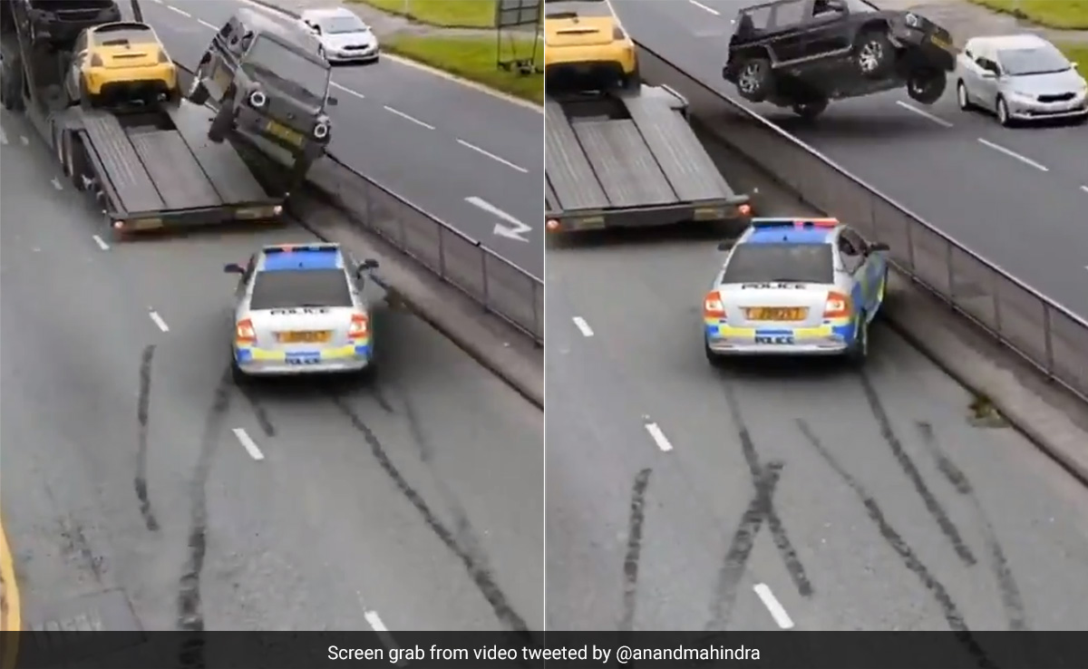 वीडियो में एक मर्सिडीज जी-वैगन को पीछा करने के दौरान एक कार ट्रेलर पर उतरते हुए दिखाया गया है. ट्रेलर के पिछले हिस्से से टकराते हुए, जी-वैगन सड़क के दूसरी ओर स्लाइड करता है और सुरक्षित रूप से लैंड करता है. जैसे कुछ हुआ ही नहीं, जी-वैगन तेज गति से दोबारा दौड़ती नजर आती है जबकि पुलिस की गाड़ी डिवाइडर पर फंस जाती है.