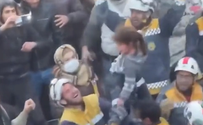 Syria Crisis: इस समय विश्व के कई देशों में भूकंप के कारण जान-माल की हानी हुई है. तुर्की और सीरिया में लोगों की स्थिति बदहाल हो चुके है. यहां कई लोग ज़िंदगी गंवा चुके हैं और कई लोग ज़िंदगी की लड़ाई लड़ रहे हैं. सुरक्षाकर्मी लगातार कोशिश कर लोगों को राहत प्रदान कर रहे हैं. अभी हाल ही में सोशल मीडिया पर एक वीडियो वायरल हुआ है. इस वीडियो में देखा जा सकता है कि एक परिवार के सदस्यों को 40 घंटे बाद सुरक्षित निकाला गया है. यह देखने के बाद सुरक्षाकर्मी बेहद खुश हुए हैं. सोशल मीडिया पर यह वीडियो वायरल हो रहा है. An entire family was rescued alive after 40 hours spent under the rubble of their destroyed home in northern Syria
