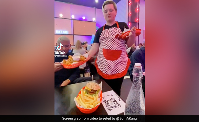 15 सेकेंड के इस वीडियो में एक कर्मचारी बर्गर, प्याज के छल्ले और चिप्स समेत खाने की तीन टोकरियां लाती दिख रही है. वह ऑर्डर टेबल पर रखती है और वीडियो रिकॉर्ड कर रहे ग्राहक को बीच की उंगली दिखाती है. वह फिर एक अनियन रिंग उठाती है और इसे सॉस में डुबाती है और दूर जाते समय इसका आनंद लेती है.
