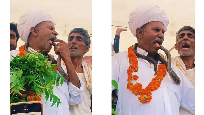 Snake Kiss Viral Video: इंस्टाग्राम पर एक ऐसा वीडियो वायरल हो रहा है, जिसे देखकर लोगों के रोंगटे खड़े हो रहे हैं, लेकिन हंसी भी छूट रही है. इस वीडियो में सफेद पोशाक और पगड़ी पहने एक अधेड़ उम्र का आदमी नजर आ रहा है. गले में सांप डालकर घूमते लोगों को तो आपने कई बार देखा होगा, लेकिन ये जनाब उससे भी एक कदम आगे हैं. वीडियो का ट्विस्ट यानि खास बात ये है जब ये आदमी अपनी जीभ यानि जुबान बाहर निकालता है... तो सांप उसकी जीभ से चिपक जाता है या यूं कहें कि काट लेता है. यह सीन देखकर न सिर्फ कैमरा चलाने वाला, बल्कि इंटरनेट पर इसे देखने वाले लोग भी सकते में हैं.