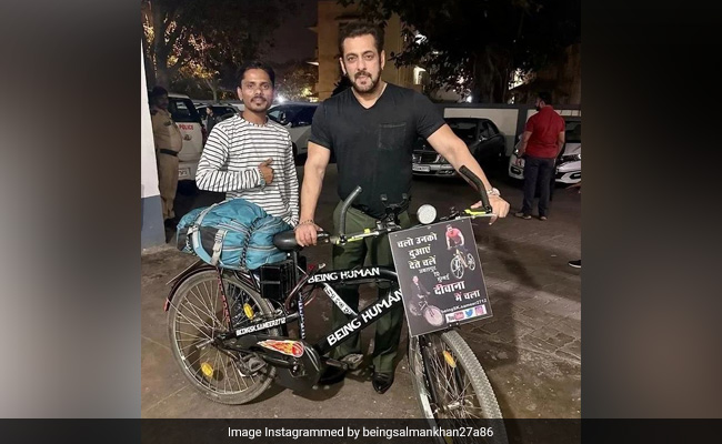 सोशल मीडिया पर वायरल हो रही एक तस्वीर में अभिनेता को शख्स के साथ "बीइंग ह्यूमन" साइकिल दिखाते हुए दिखाया गया है. सलमान के एक फैन पेज द्वारा इंस्टाग्राम पर पोस्ट की गई तस्वीर के कैप्शन में लिखा है, "जबलपुर निवासी समीर मेगास्टार से मिलने के लिए 1100 किमी पैदल चलकर मुंबई पहुंचे."