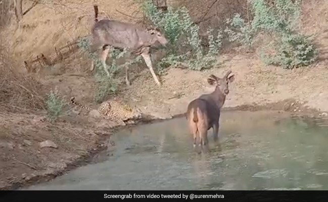 एक साथ पानी पीते दिखे तेंदुआ और सांबर