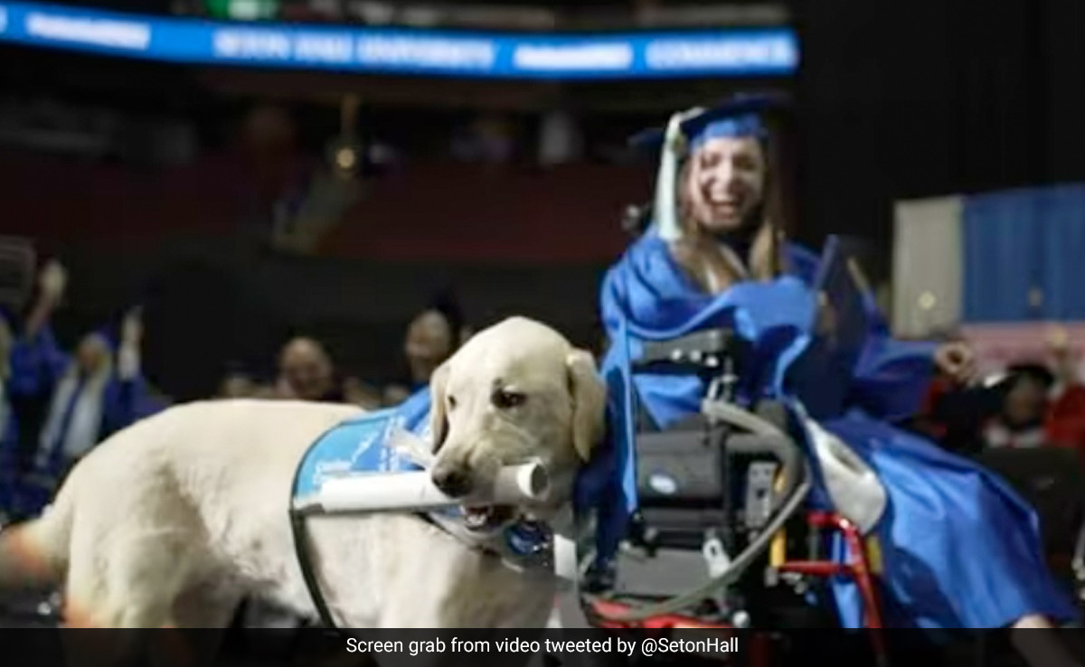 न्यू जर्सी के सेटन हॉल विश्वविद्यालय में ग्रेजुएशन सेरेमनी के दौरान का एक वीडियो इन दिनों तेजी से वायरल हो रहा है. यूनिवर्सिटी के इंस्टाग्राम पेज पर शेयर किए गए इस वीडियो में एक दिव्यांग छात्रा को व्हीलचेयर पर पोडियम की ओर आते देखा जा सकता है, उनके साथ ही एक प्यारा सर्विस डॉग भी पोडियम पर पहुंचता है, जो छात्रा को डायरेक्ट करता दिखाई पड़ रहा है. इस कमाल के वीडियो का आखिरी हिस्सा आपको भी गुदगुदा देगा. इस दौरान जब डॉग को सर्टिफिकेट सौंपा जाता है, तो वहां मौजूद हर शख्स के चेहरे पर मुस्कान खिल उठती है.