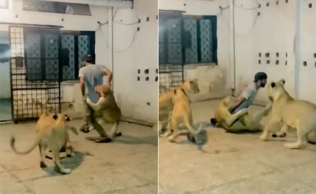 Lions Attacked A Man: जंगल के राजा शेर...जिसके नाम भर से ही लोग की डर के मारे रूह कांप जाती है. यूं तो अक्सर शेरों को जंगल में या फिर पिंजरे में देखा जाता है, लेकिन अगर सोचिए ये आपके सामने आ जाए तो क्या होगा. जाहिर सी बात है डर के मारे थरथर कांपना तो तय है. अक्सर लोग पिंजरे में बंद शेर को भी कमजोर समझने की गलती कर बैठते हैं, जिसका परिणाम उन्हें बाद में भुगतना पड़ता है. इंटरनेट पर आए दिन खूंखार शेरों के हमले के वीडियोज देखने को मिलते रहते है, लेकिन आज जो वीडियो हम आपको दिखाने जा रहे हैं, उसे देखकर आपकी डर के मारे हालत खराब हो जाएगी.