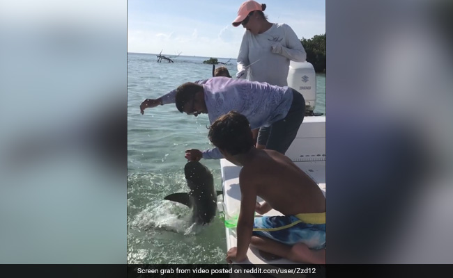 सोशल मीडिया पर वायरल हो रहे एक वीडियो में समुद्र में एक शख्स शार्क को छेड़ रहा था तभी शार्क (Shark) ने शख्स काट लिया. रेडिट (Reddit) पर पोस्ट की गई 11 सेकंड की क्लिप में एक शख्स को एक महिला और दो बच्चों के साथ एक नाव पर पानी में छोड़ने के बाद छोटी शार्क को छेड़ते हुए दिखाया गया है. कुछ कुहनी मारने के बाद, मछली जाग जाती है और तुरंत इधर-उधर घूमने लगती है और शख्स की हथेली को काटने लगती है. वह अपनी उंगलियां बाहर निकालने की कोशिश करता है लेकिन शार्क कुछ देर के लिए उसके हथेली को अपने मुंह में भर लेती है. शख्स अंत में अपना हाथ बाहर निकालता है और शार्क का मुंह खून से भरा हुआ दिखाई देता है.