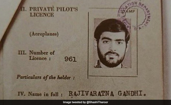 शशि थरूर ने ट्विटर पर राजीव गांधी के निजी पायलट लाइसेंस की एक तस्वीर शेयर की. इसमें उनका पूरा नाम, जो राजीवरत्न गांधी (Rajivaratna Gandhi) है, और नई दिल्ली में सफदरजंग रोड पर उनका पुराना पता है. लाइसेंस में गांधी की एक युवा ब्लै एंड व्हाइट तस्वीर भी थी.