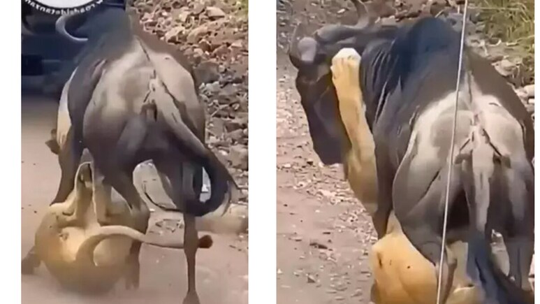 Lion Beaten Badly By Wild Buffalo: जंगल का राजा कहे जाने वाले शेर को भी कभी-कभी हार का सामना करना पड़ता है और ऐसा ही एक दृश्य इन दिनों सोशल मीडिया पर वायरल हो रहा है. इस वीडियो में शेर और जंगली भैंसे के बीच की जबरदस्त लड़ाई ने इंटरनेट पर तहलका मचा दिया है. वीडियो में दिखाया गया है कि एक जंगली भैंसा, शेर पर इस कदर हावी हो जाता है कि शेर फाइट बैक करने में पूरी तरह नाकाम रहता है. जंगल का यह शिकारी, जो आमतौर पर दूसरों का शिकार करता है, खुद जंगली भैंसे के गुस्से का शिकार बन जाता है.