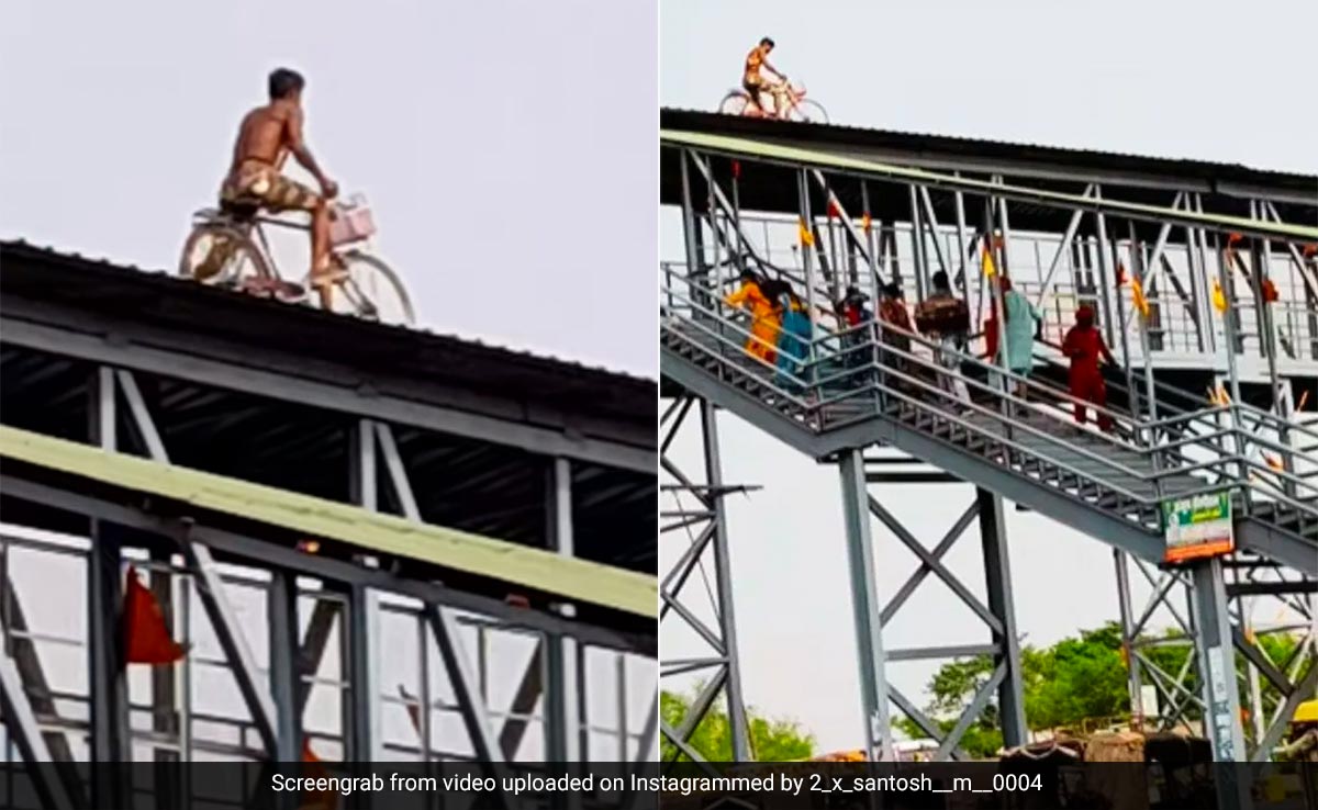 साइकिल लेकर फुट ओवरब्रिज की छत पर चढ़ा शख्स