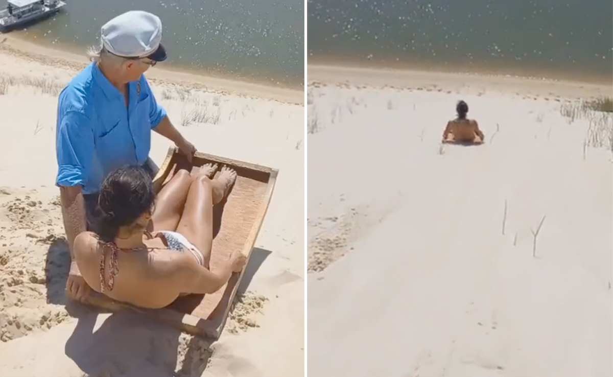 The Figen नाम के ट्विटर हैंडल से शेयर हुए इस वीडियो में स्लेज पर बैठी एक महिला नजर आती है, लेकिन ये स्लेज बर्फ पर नहीं बल्कि एक ऊंचे रेतीले टीले पर रखा है, जिसे वहीं मौजूद एक शख्स धकाता है. टीले से नीचे एक खूबसूरत झील भी नजर आ रही है. अंदाजा लगाया जा सकता है कि, स्लेज पर बैठी महिला झील की लहरों पर ही सवार होगी. शख्स महिला के स्लेज को आगे धक्का लगाता है और जो सोचा था वही हुआ. टीले से फिसलती हुई महिला तेज रफ्तार से नीचे की ओर जाती है और उसके बाद झील की शांत लहरों पर सवार हो जाती है. इस वीडियो को देखते रहेंगे तो ऐसा लगेगा कि, महिला झील को पूरा पार कर लेगी, लेकिन फिर जो हुआ उसे देखकर डर जाएंगे या हैरान ही रह जाएंगे.