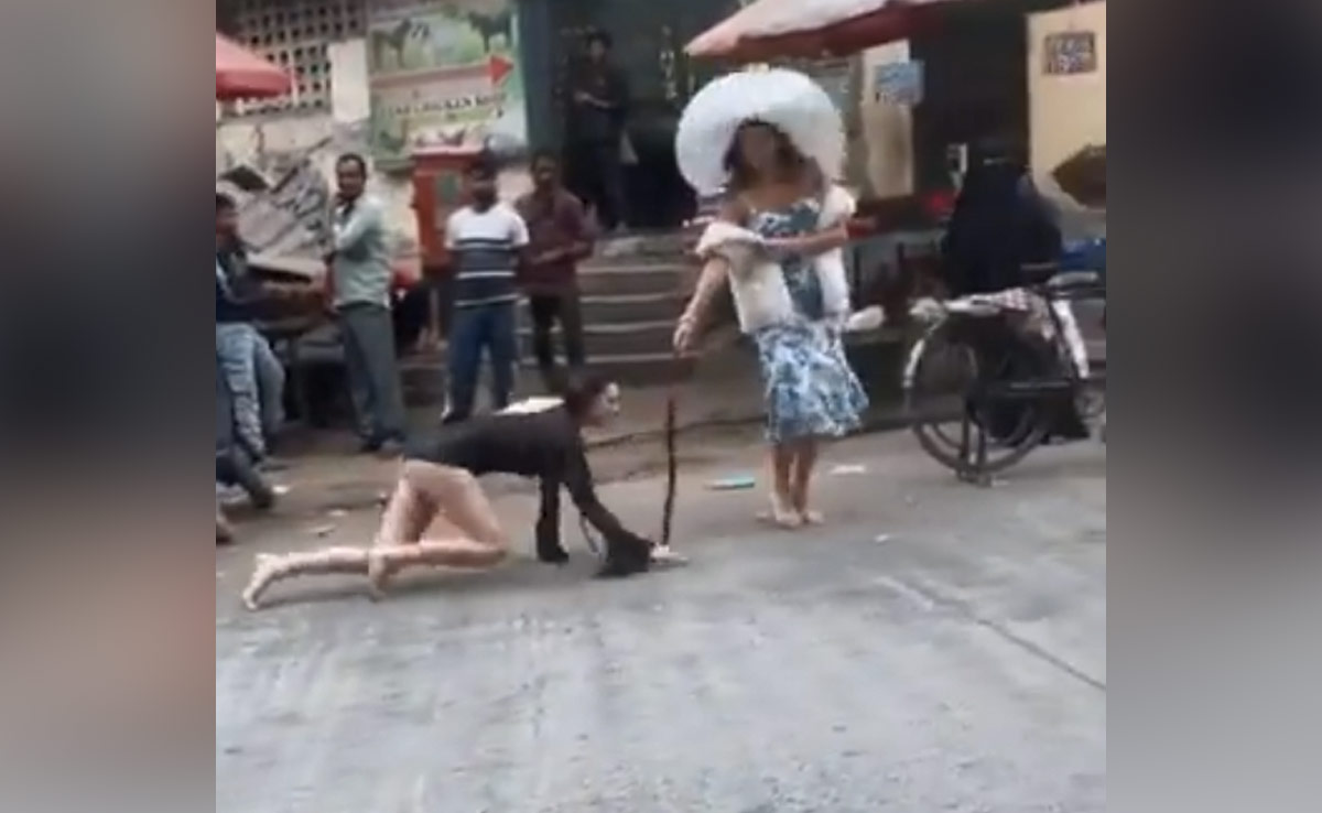 वायरल हो रहा यह हैरान कर देने वाला वीडियो मुंबई का बताया जा रहा है. वीडियो में देखा जा सकता है कि, कैसे एक महिला एक लड़की के गले में पट्टा बांधकर उसे सड़क पर घुमा रही है. किसी जानवर की तरह घुटने और हाथ के बल सड़क पर चलती इस लड़के ने ब्लैक कलर की ड्रेस पहनी हुई है. वीडियो में लड़की किसी जानवर की तरह बिहेव करती दिखाई दे रही है. दावा किया जा रहा है कि सोशल मीडिया पर व्यूज के लिए ऐसा किया गया है.