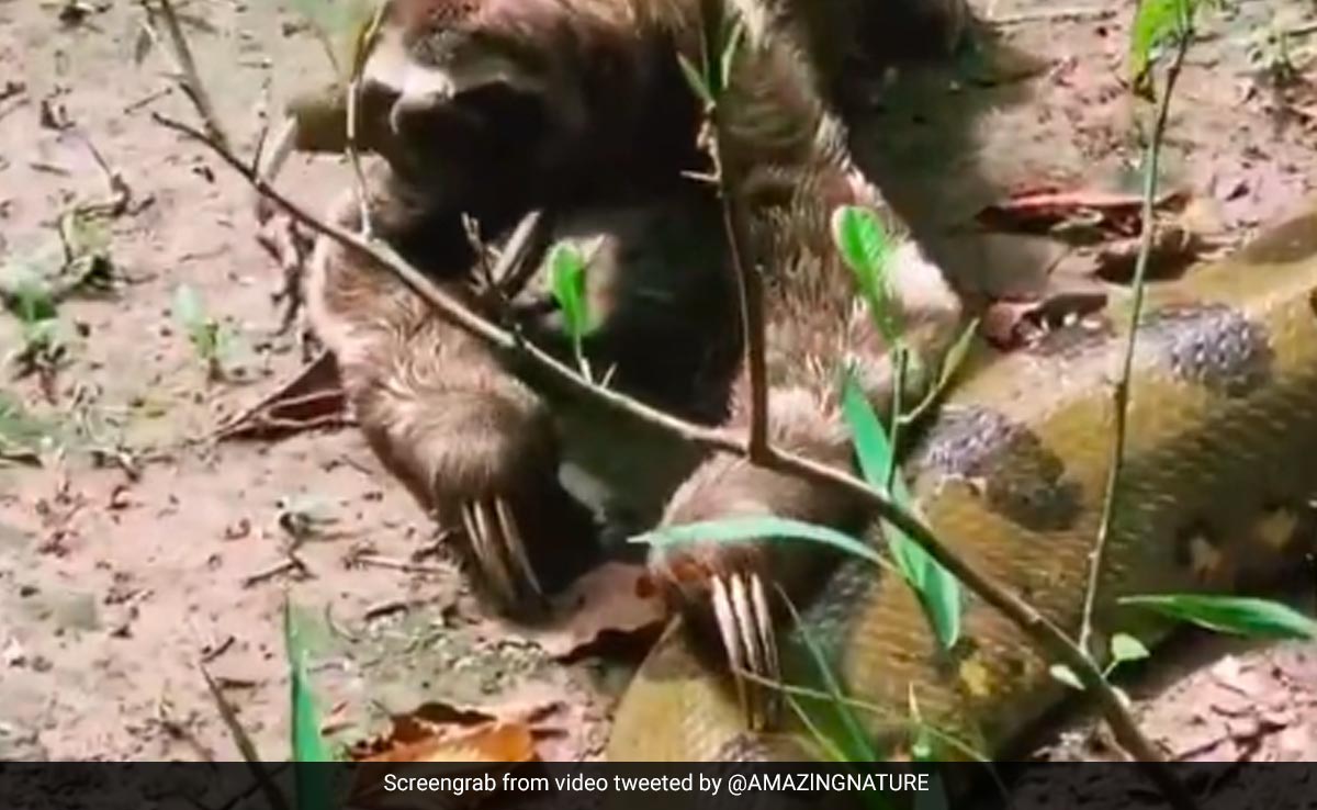 इंटरनेट पर अक्सर जानवरों के वीडियोज सामने आते रहते हैं. किसी वीडियो में दो जानवरों की अनोखी दोस्ती नजर आती है, जो किसी में कोई कमाल के करतब करता दिखता है तो वहीं किसी वीडियो में कोई जंगली जानवर दूसरे का शिकार करता नजर आता है. लेकिन हाल में सामने आया एक वीडियो एक नन्हे से जानवर की बहादुरी को दिखाता है. एक विशालकाय एनाकोंडा (giant anaconda) के आगे से एक सुस्त सा स्लॉथ बड़े ही आराम से गुरजरता है. जो एनाकोंडा एक झटके में इंसानों को भी चट कर सकता है, इस स्लॉथ को छूता तक नहीं.