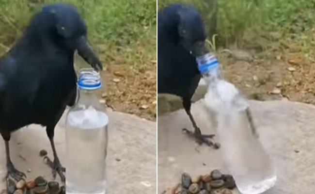 वीडियो में देखा जा सकता है कि एक कौए के सामने प्लास्टिक की बोतल में पानी रखा है और साथ ही कुछ छोटे-छोटे पत्थर के टुकड़े भी पड़े हैं. बोतल में पानी आधे से अधिक है, कौआ इन पत्थरों को बोतल में डालकर आसानी से पानी पी सकता है, लेकिन वो ऐसा नहीं करता बल्कि अपनी नई तकनीक आजमाता है. वह अपनी चोंच से बोतल को नीचे गिरा देता और इससे पानी गिरने लगता है और कौआ पानी पी लेता है. इसके बाद कौआ कुछ पानी सेव करके भी बोतल में रख लेता है.