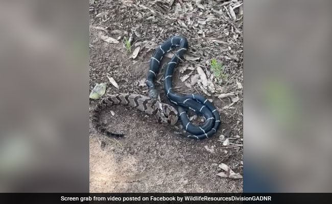 अमेरिका के जॉर्जिया (Georgia) में एक शख्स ने हाल ही में एक सांप को दूसरे, बड़े सांप को खाते हुए (snake eating another) देखा. 80 वर्षीय टॉम स्लैग ने एक जहरीले लकड़ी के रैटलस्नेक (rattlesnake) को खा रहे किंगस्नेक (kingsnake) को देखा. जॉर्जिया निवासी घटना के फुटेज को रिकॉर्ड करने में कामयाब रहे. वीडियो में रैटलस्नेक के निचले आधे हिस्से को किंगस्नेक के मुंह से निकलते हुए दिखाया गया है. क्लिप को जॉर्जिया डिपार्टमेंट ऑफ नेचुरल रिसोर्सेज (DNR) Georgia Department of Natural Resources (DNR) द्वारा कैप्शन के साथ पोस्ट किया गया था, "किंग्सनेक बनाम टिम्बर रैटलस्नेक."