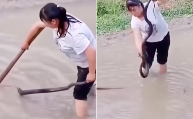 वायरल हो रहे इस वीडियो में पानी में एक सांप दिखाई दे रहा है, जो अच्छा-खासा बड़ा है, जिसे देखने के बाद शायद उस जमीन का मालिक भी सांप को निकालने के लिए पानी में घुसने से पहले हजार बार सोचेगा, लेकिन तभी पानी में एक दबंग महिला दिखाई पड़ती है, जो धीरे-धीरे सांप के पास जाती दिखाई दे रही है.वीडियो में महिला के हाथ में कुदाल जैसा कुछ दिखाई पड़ रहा है, जिसके सहारे महिला सांप को पकड़ने की कोशिश कर रही होती है.