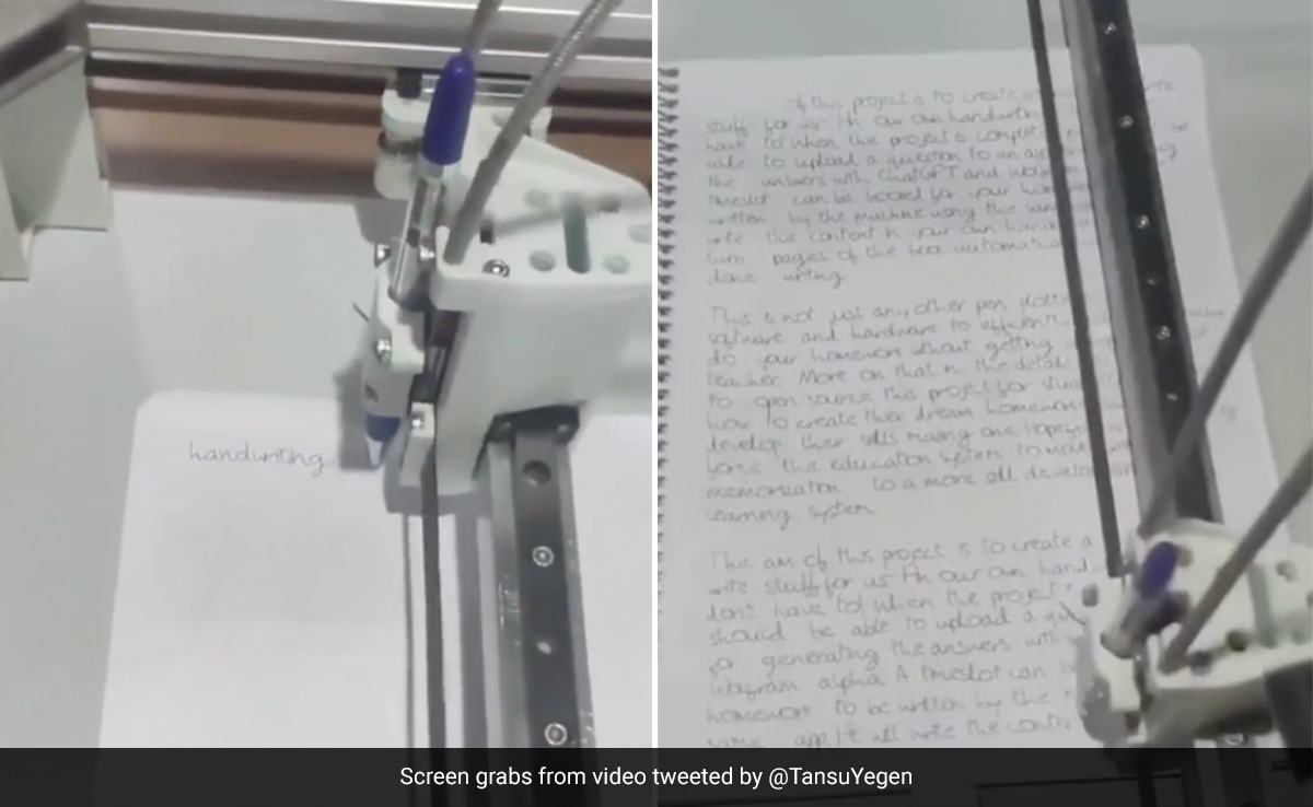 वीडियो को देखकर अंदाजा लगाया जा सकता है कि, अब बच्चों को रिसर्च वर्क और असाइनमेंट लिखने के लिए ज्यादा मेहनत व घंटों समय निकालने की जरूरत नहीं है. यही वजह है कि हाल ही में वायरल इस वीडियो में दिख रही मशीन के काम को देखकर लोग हक्के-बक्के रह गए हैं. सोशल मीडिया प्लेटफॉर्म ट्विटर पर इस वीडियो को शेयर किया गया है, जिसे देखकर लोगों को अपनी ही आंखों पर भरोसा करना मुश्किल हो रहा है. वीडियो को तांसुंग यागेन नाम के अकाउंट से शेयर करते हुए कैप्शन में लिखा गया है, 'टीचर्स- हम सिर्फ हाथ से लिखा प्रोजेक्ट लेंगे AI के आने के बाद, इस पर बच्चों का जवाब.'