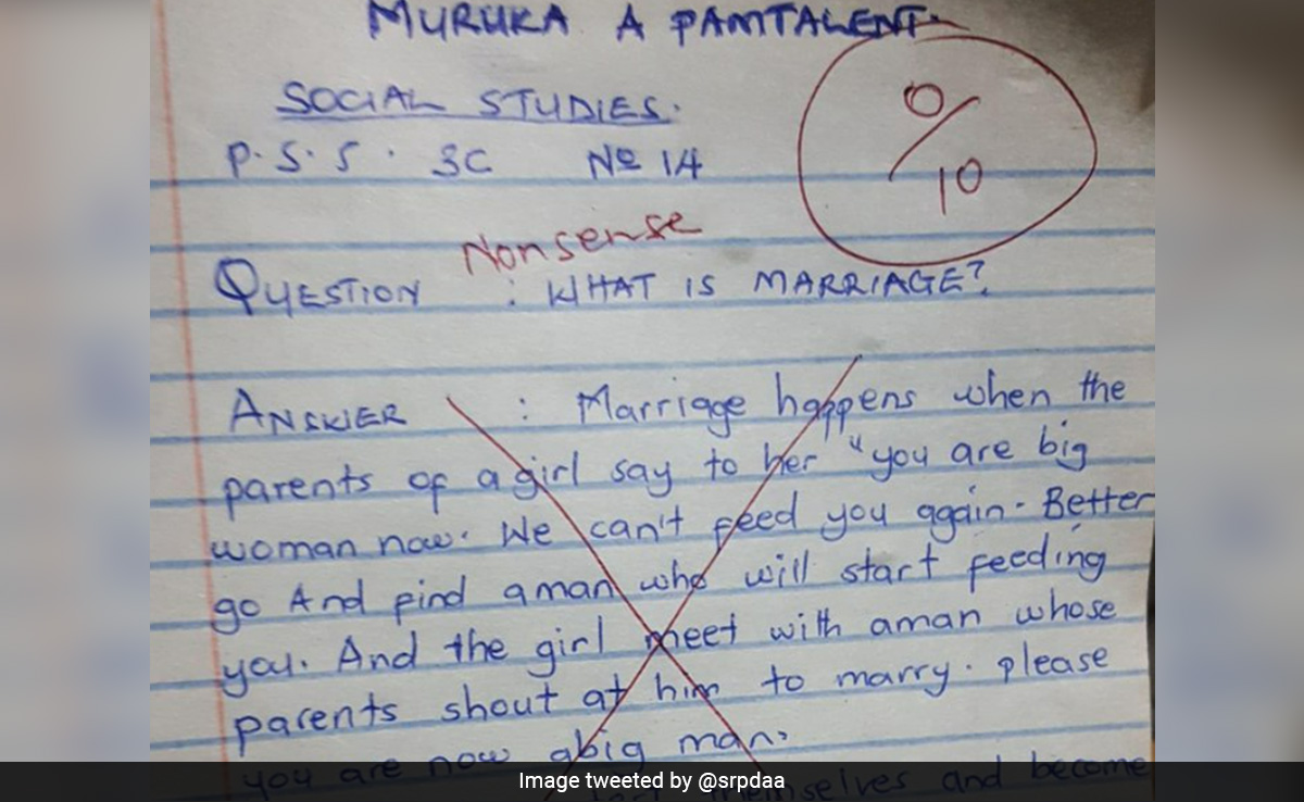 दरअसल, एक स्टूडेंट ने सामाजिक विज्ञान की परीक्षा में शादी पर एक ऐसी अजीबोगरीब परिभाषा लिखी, जिसे देखने के बाद मास्टर साहब खुद सन्न रह गए. भले टीचर ने स्टूडेंट को इस पर कोई नंबर नहीं दिया, लेकिन ऐसा रिमार्क लिखा कि, आप भी हंस-हंसकर लोटपोट हो जाएंगे. 10 नंबर के इस सवाल में टीचर ने स्टूडेंट से शादी की परिभाषा (definition of marriage) लिखने के लिए कहा था, जिसके जवाब में छात्र ने लिखा कि, 'शादी तब होती है जब लड़की के माता-पिता उससे कहते हैं कि अब तुम बड़ी हो गई हो. हम तुमको अब नहीं खिला सकते. बेहतर यही है कि जाओ और एक ऐसे आदमी को खोजो, जो तुम्हें अब पाल सके और फिर वो ऐसे लड़के से मिलता है. जिससे उसके माता-पिता उसकी शादी करना चाहते हैं.'
