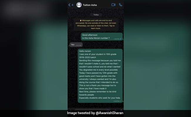 लेकिन, बात यहीं खत्म नहीं हुई. 12 वीं कक्षा की परीक्षा उत्तीर्ण करने के बाद उसने अपनी टीचर से दोबारा बात की, जिसे ट्यूशन टीचर (tuition teacher) ने कहा था की, तुमसे नहीं हो पाएगा, तुम फेल हो जाओगी. "अगली बार, कृपया लोगों के प्रति दयालु होना याद रखें. विशेष रूप से वे छात्र जो आपकी मदद चाहते हैं, ”उसने व्हाट्सएप (WhatsApp) पर भेजे गए लंबे टेक्स्ट मैसेज के आखिर में लिखा, और अगर आप ऐसे शख्स हैं जो अपने जीवन में कुछ इसी तरह से गुजरे हैं, तो एक अच्छा मौका है कि जब आप इस बातचीत से खुद को जोड़ पाएंगे.