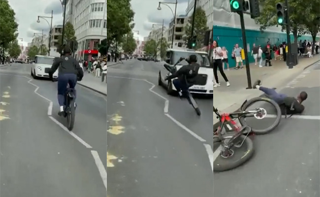 वीडियो में एक शख्स साइकिल पर सवार होकर बीच सड़क स्टंट करता नजर आ रहा है. इस बीच वो अचानक से एक कार के आगे आ जाता है और स्टंट (Cycle Stunt Video) करने की कोशिश करने लगता है, लेकिन तभी वो साइकिल पर से अपना नियंत्रण खो बैठता है और कार से जा टकराता है.