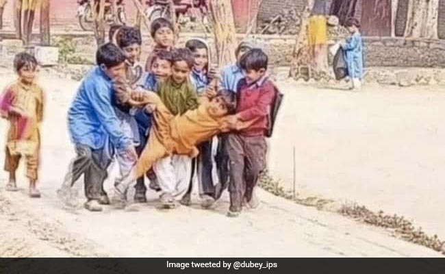 तस्वीर में देखा जा सकता है कि एक बच्चा स्कूल नहीं जा रहा है. ऐसे में कुछ बच्चे उस छात्र को जबर्दस्ती टांग कर स्कूल ले जा रहे हैं. लोगों को ये तस्वीर बहुत ही ज़्यादा पसंद आ रही है. वायरल हो रही इस तस्वीर पर कई लोगों के रिएक्शन्स आ रहे हैं. इस तस्वीर को सोशल मीडिया पर आईपीएस अधिकारी सुभाष दुबे ने शेयर की है, जिसे लोग बहुत ही ज़्यादा पसंद कर रहे हैं.