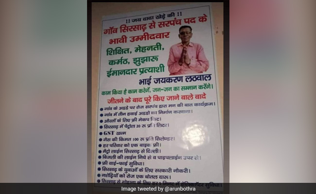 दरअसल, सोशल मीडिया पर जो पोस्टर वायरल हो रहा है, उसमें देखा जा सकता है कि चुनावी घोषणा पत्र में बहुत ही ज्यादा घोषणाएं हैं, जो सोशल मीडिया पर चर्चा का विषय बना हुआ है. इस पोस्टर के मुताबिक गांव सिरसाढ़ से सरपंच पद के भावी उम्मीदवार भाई जयकरण लठवाल ने चुनाव जीतने के बाद पूरे किए जाने वाले वादों की एक लंबी-चौड़ी लिस्ट शेयर की है, जिसमें कुल 13 वादे किए गए हैं और इनमें से लगभग सभी वादे बस हवा-हवाई ही लग रहे हैं.