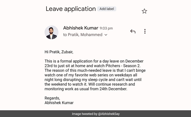 इस पोस्ट में देखा जा सकता है कि एक शख्स छुट्टी मांग रहा है. वजह ये है कि वो घर पर रहकर वेब सीरिज़ देखना चाहता है. पत्र में देखा जा सकता है कि वो “Pitchers” नाम की वेब सीरीज़ देखना चाहता है. शख्स ने एप्लिकेशन में लिखा है- ‘ये 23 दिसंबर की छुट्टी लेने के लिए औपचारिक आवेदन है, ताकि घर पर बैठकर Pitchers- Season 2 देखा जा सके. मेरी पसंदीदा वेब सीरीज़ को वीकडेज़ में देखने की वजह से स्लीप साइकिल गड़बड़ होती है और मैं वीकेंड का इंतज़ार नहीं कर सकता. मैं रिससर्च और मॉनिटरिंग का काम 24 दिसंबर को शुरू कर दूंगा.'