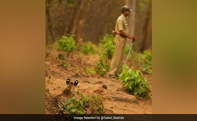 ट्विटर पर शेयर हुई इस तस्वीर में एक जवान हाथ में प्लास्टिक की लाठी लिए अपनी ड्यूटी पर तैनात है और उसके ठीक सामने एक शावक बैठा है. शावक जवान की ओर देख रहा है, हालांकि जवान बिल्कुल सहज भाव से अपना काम कर रहा है, जैसे उसे खबर ही न हो कि उसके आस-पास कितना खतरा है. जवान ने हाथ में प्लास्टिक की लाठी है जिससे जंगली जानवरों से लड़ना बेहद मुश्किल है फिर भी वह अपनी ड्यूटी निभाने में टस से मस नहीं होते.